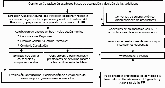 Los prestadores de servicios recibirán automáticamente el servicio para su formación a partir de que sean contratados por los productores. Por otra parte, las solicitudes de apoyo de los productores, organizaciones o IFRīs serán resueltas en tres niveles distintos, dependiendo de los montos de los mismos y según límites definidos por el Comité de Capacitación: a) El Coordinador Regional; b) El Director General Adjunto de Promoción; c) el propio Comité de Capacitación y Asesoría.