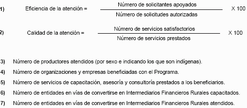 En conformidad con lo dispuesto por el Presupuesto de Egresos de la Federación, la evaluación incluirá indicadores desagregados por sexo y por grupo de edad, de forma que se demuestre el acceso equitativo y . no discriminatorio de las mujeres e indígenas a los beneficios del Programa, así como propiciar la protección del medio ambiente y los recursos naturales. Para los efectos anteriores se emplearán los siguientes indicadores: