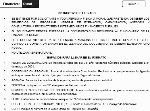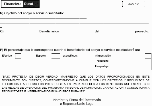 Para acceder a los servicios del Programa, los productores, las organizaciones de productores, así como los grupos interesados en constituirse como Intermediarios Financieros Rurales, deberán presentar a la FR la "Solicitud de apoyos y servicios de capacitación, asesoría y consultoría", conforme al formato aprobado por el Comité de Capacitación y Asesoría y el cual se adjunta a las presentes Reglas como Anexo No. 1. Esta solicitud contiene los siguientes datos: fecha de elaboración; Coordinación Regional y Agencia de la FR; tipo de persona; nombre o razón social; sexo; registro federal de contribuyentes; clave única de registro de población; domicilio; teléfono; actividad económica; organización a la que pertenece el solicitante; tipo de población; tipo de apoyo; monto solicitado; objetivo del apoyo o servicio solicitado; beneficiarios del proyecto; porcentaje que le corresponde cubrir al beneficiario del apoyo o servicio y . nombre y firma del interesado o representante legal.
