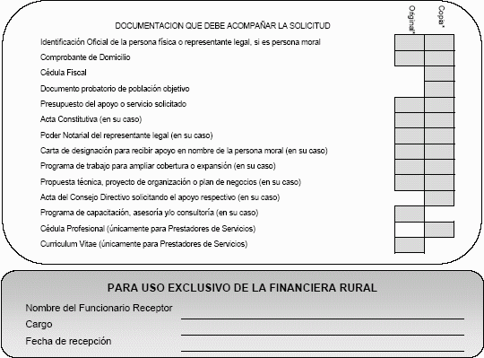 * Para uso exclusivo de la Financiera Rural. El funcionario que recibe deberá marcar el recuadro después de comprobar que se anexa la documentación requerida.