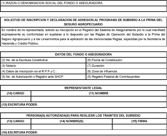 CUARTO.- Las Aseguradoras y Fondos que otorguen las coberturas de seguros elegibles de acuerdo con las Reglas, deberán registrarse ante AGROASEMEX, para lo cual, le presentarán la cédula de inscripción a que se refiere el modelo que como anexo "A" forma parte de estos Lineamientos.