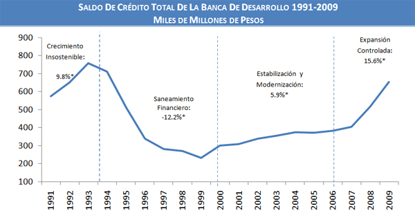 - Crecimiento insostenible (1991-1994): el crecimiento en la cartera de la Banca de Desarrollo en dicho periodo resultó insostenible. Malos procesos de otorgamiento y seguimiento de crédito llevaron a una acumulación de cartera vencida que requirió de un proceso posterior de saneamiento y la necesidad de que el Gobierno Federal aportara recursos fiscales para solventar los quebrantos.