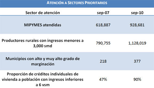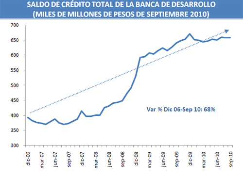 Al tercer trimestre de 2010, el saldo del crédito total de la Banca de Desarrollo a sus sectores de atención, es decir, los sectores privado y social, así como los gobiernos estatales y municipales, ascendió a 658 mil millones de pesos. Dicho monto es 323 mil millones de pesos, mayor que el de diciembre de 2006, lo que representa un crecimiento real del 68%.