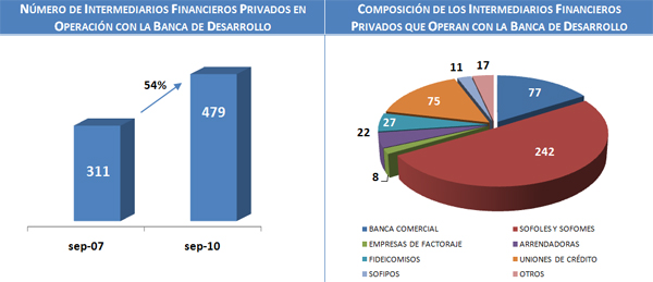 La Banca de Desarrollo busca llegar a su población objetivo a través de los Intermediarios Financieros Privados (IFP) ya sea con fondeo o garantías. Al mes de septiembre 2010, la Banca de Fomento mantiene operación con 479 IFP, 168 IFP más en operación que los que se tenían al mes de septiembre de 2007.
