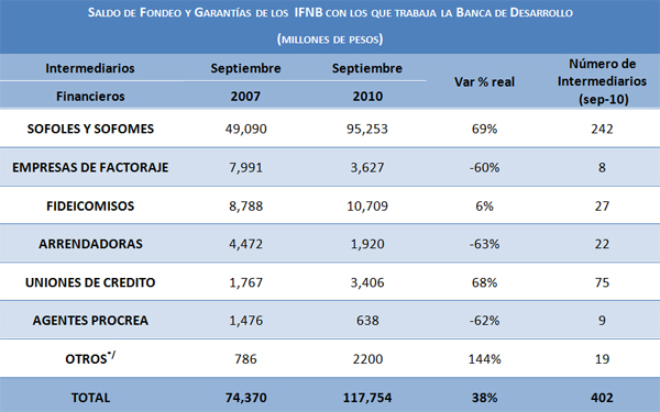 De esta forma, entre septiembre de 2007 y septiembre 2010, el número de intermediarios financieros no bancarios, a través de los cuales la Banca de Desarrollo canaliza recursos pasó de 246 a 402. El saldo de la cartera de crédito y garantías a estos intermediarios se incrementó en el mismo periodo en 43 mil millones de pesos, esto es 38% en términos reales. Destaca el crecimiento en el saldo de crédito de la Banca de Desarrollo a Uniones de Crédito y Sofoles y Sofomes, que de septiembre 2007 a septiembre 2010 se incrementó en 68% y 69% real respectivamente.