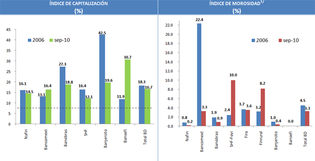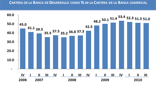 En esta administración, también se ha incrementado la cartera de la Banca de Desarrollo como porcentaje de la cartera de la banca privada (a los mismos sectores que atiende la Banca de Desarrollo: rural, industrial, vivienda, de servicios e infraestructura) pasando de representar el 45% al cierre de 2006 a representar el 51% en septiembre de 2010. Ello se ha dado como parte de la política de complementariedad de la Banca de Desarrollo con el sector privado financiero. Dicha proporción alcanzó un nivel máximo de 53% en diciembre de 2009 después de que la Banca de Desarrollo desempeñó un rol contracíclico ante la disminución del financiamiento del sector privado.