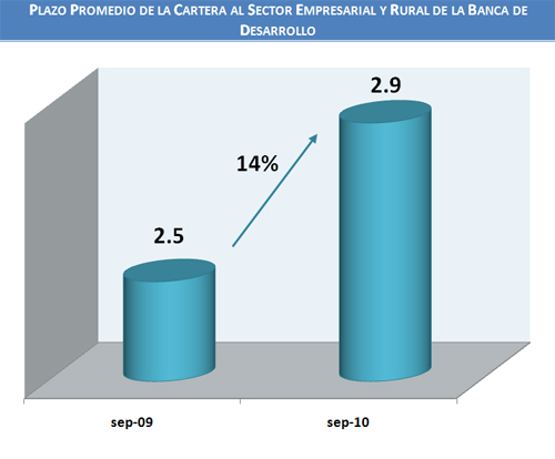 La Banca de Desarrollo tiene dentro de sus principales estrategias para promover el crecimiento económico, impulsar el financiamiento de largo plazo para apoyar la competitividad y capitalización de las unidades productivas. En los últimos 12 meses, el plazo promedio de la cartera de las instituciones de Banca de Desarrollo del sector empresarial y del sector rural en su conjunto, se incrementó en 14%, pasando de un plazo promedio de su cartera de 2.5 años en septiembre 2009 a casi 3 años en septiembre 2010. Por su parte, la cartera de Banobras y la SHF, dada la naturaleza del tipo de proyectos que financian, han mantenido durante el último año un plazo promedio de su cartera de 13 y 17 años respectivamente.